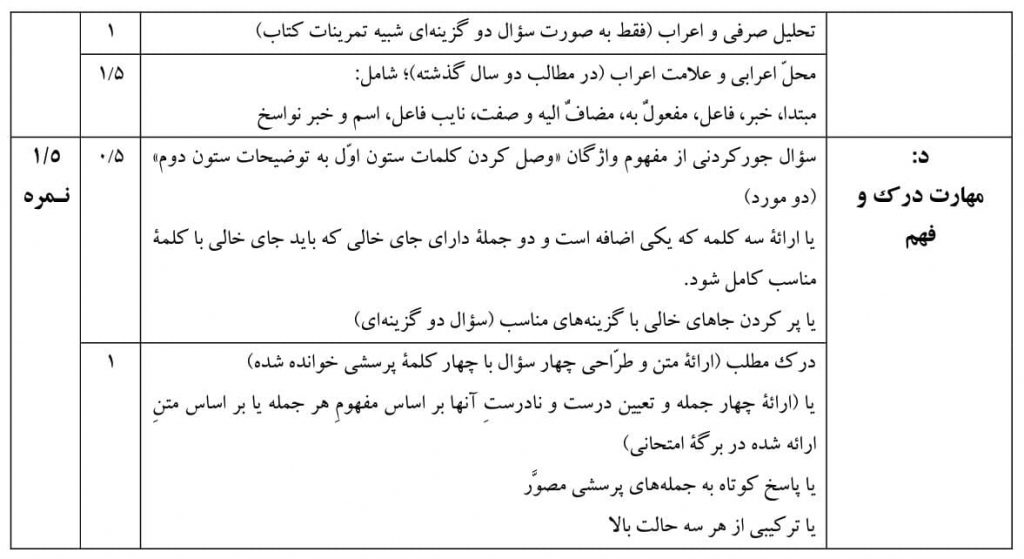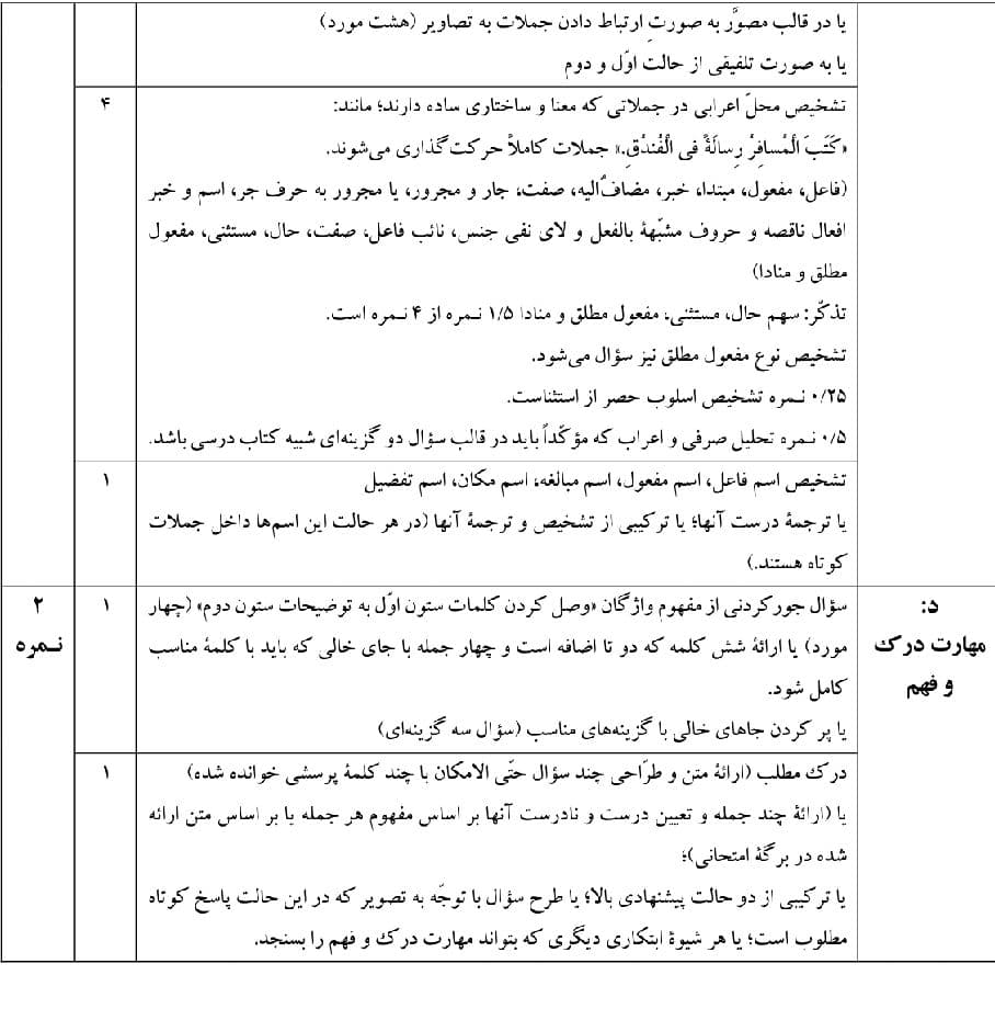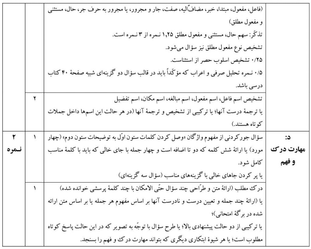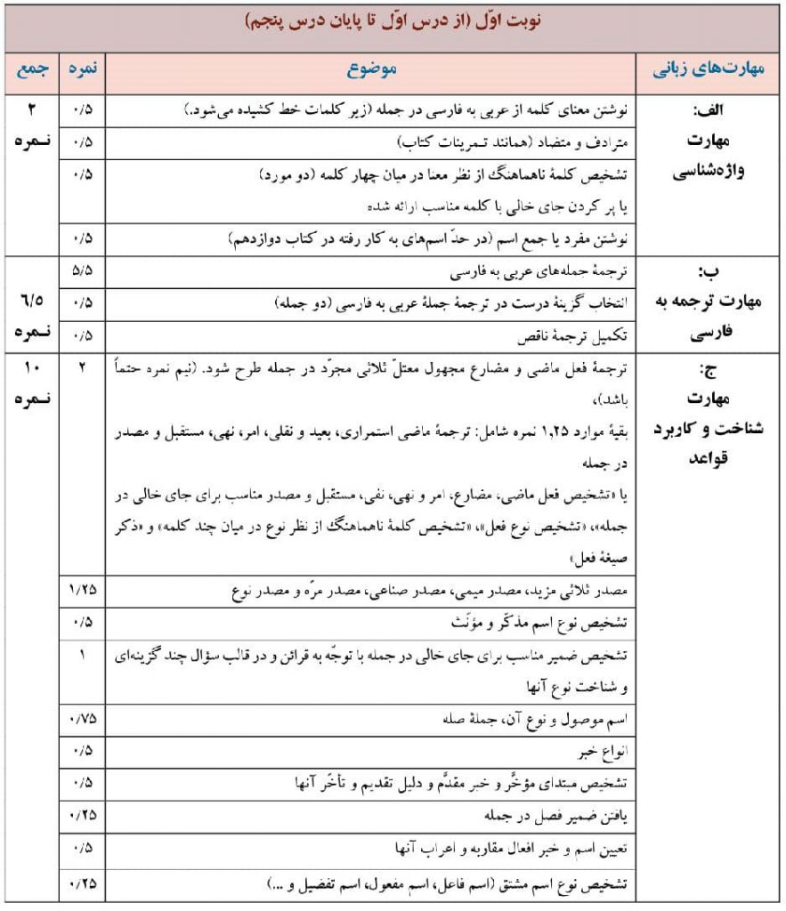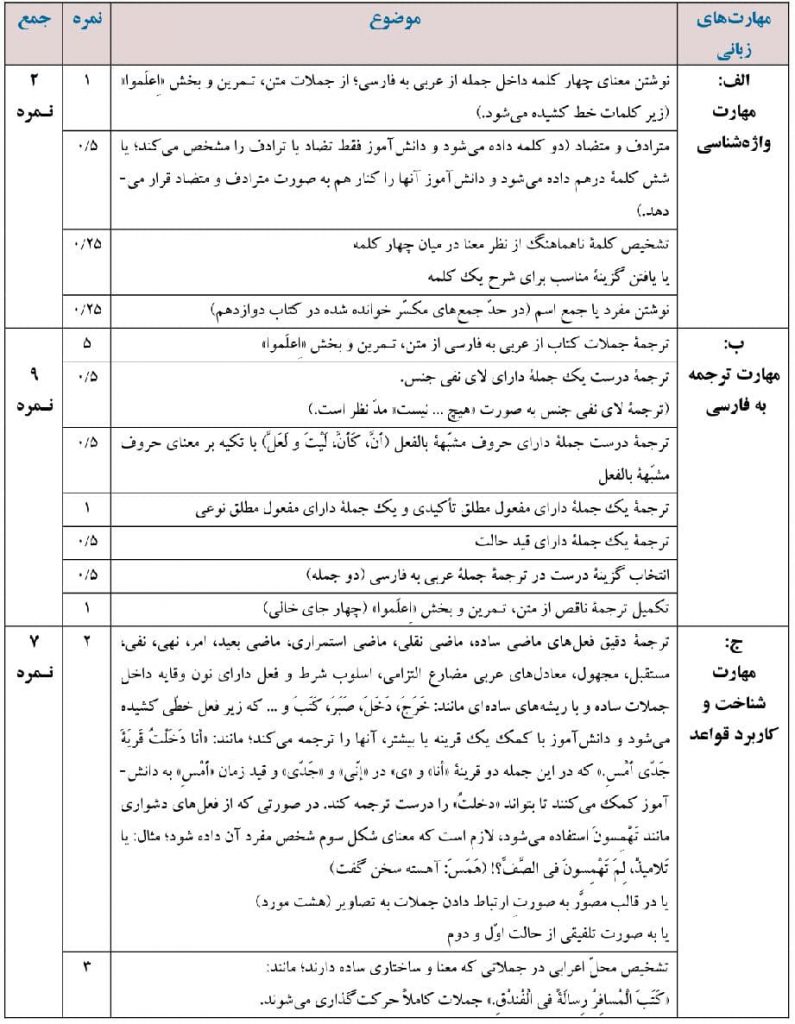 2_حجم اصلی سوالات امتحانی ترجمه از عربی به فارسی و کاربرد واژگان است که باید تنوع داشته باشد.