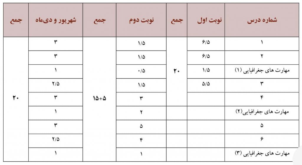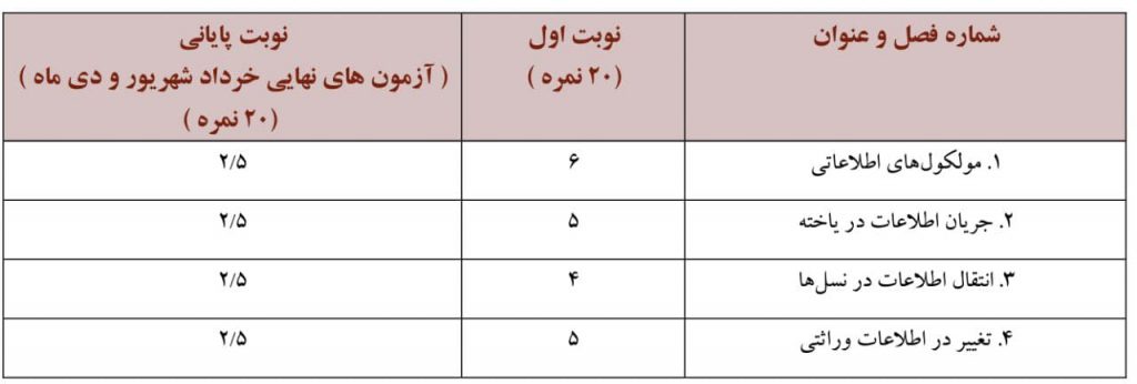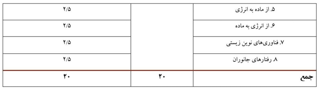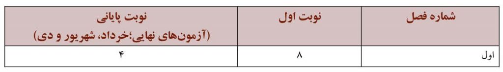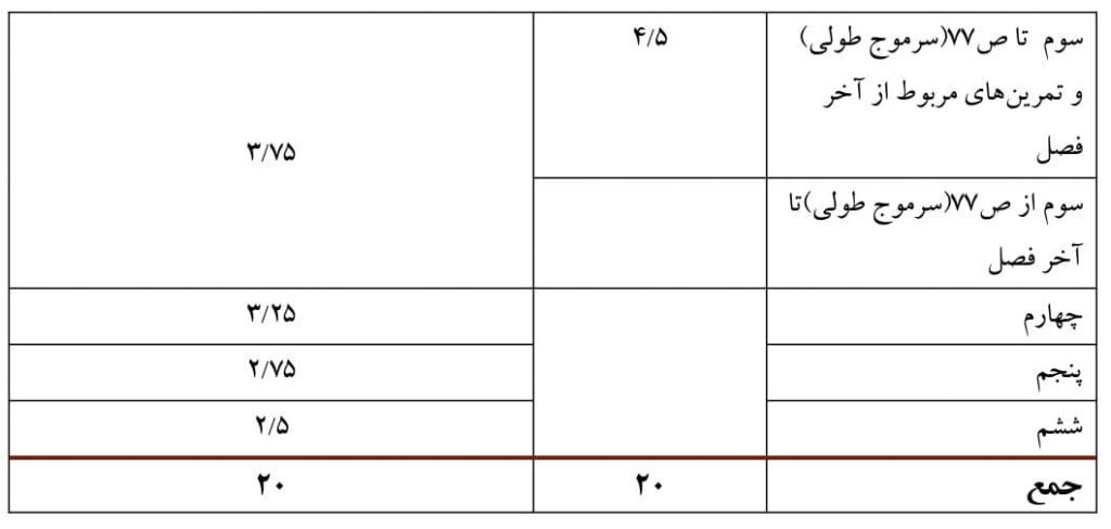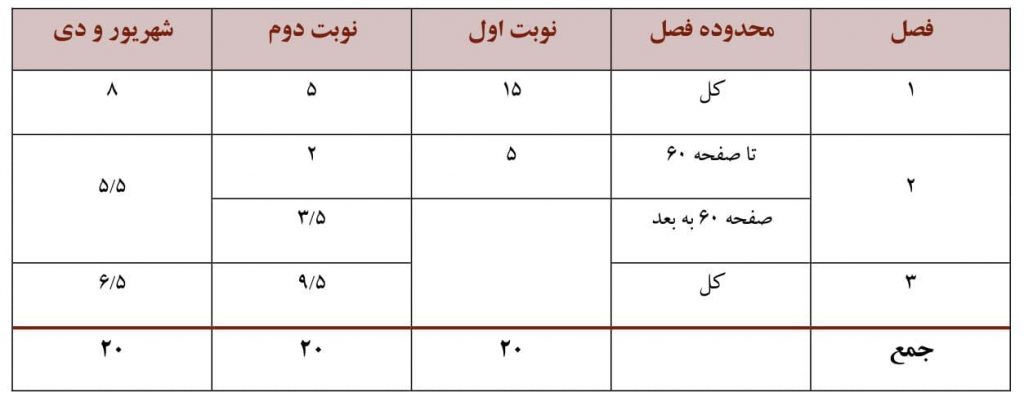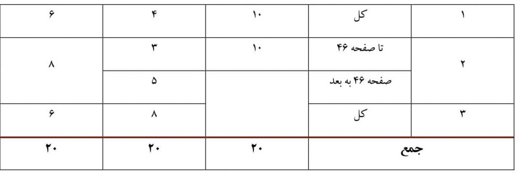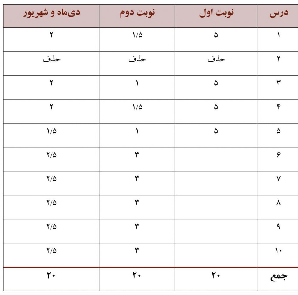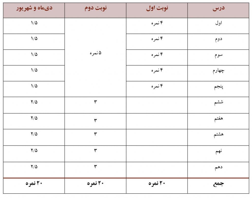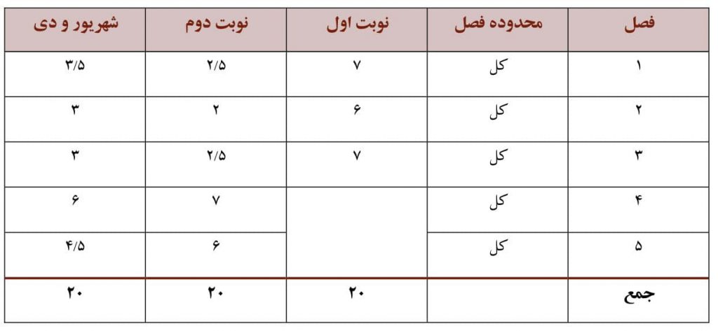 بارم بندی نوبت دوم از نمره ۴۰ در برگه امتحان نهایی به شرح زیر است: